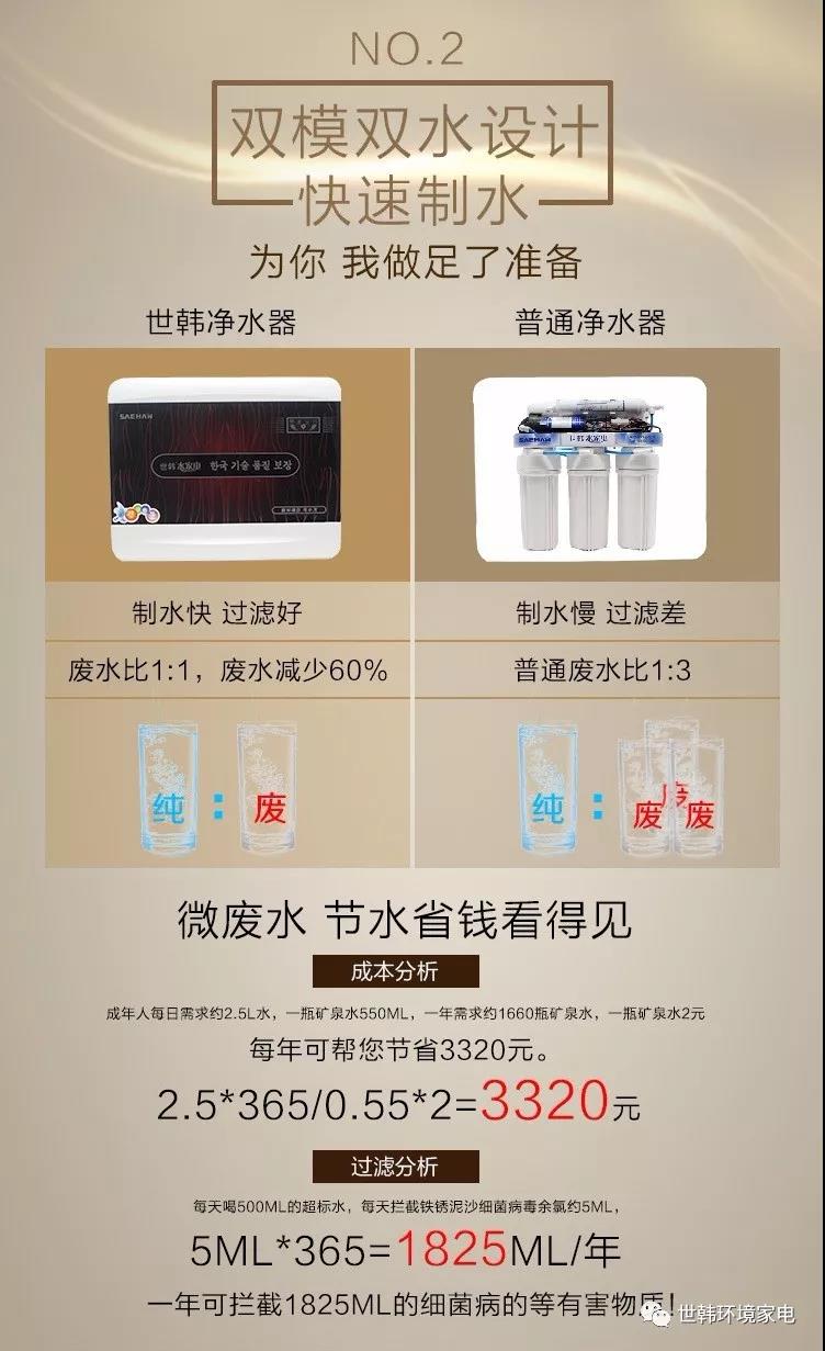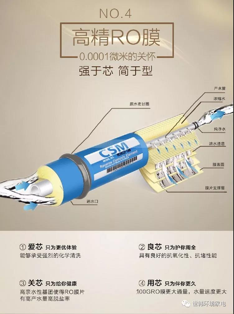 第四項:高精節水RO膜,0.0001微米的關懷.強于芯,簡于型.從源頭控制低廢水,一級節能水效,采用世韓CSM1:1節水RO膜,0.05元/天的廢水消耗,為你滴滴計較。