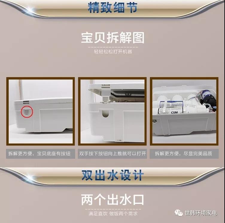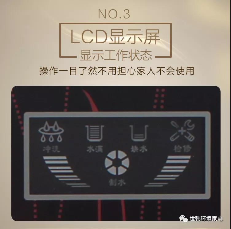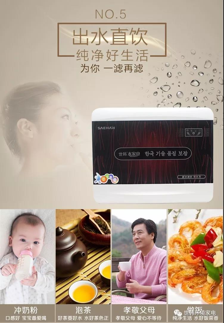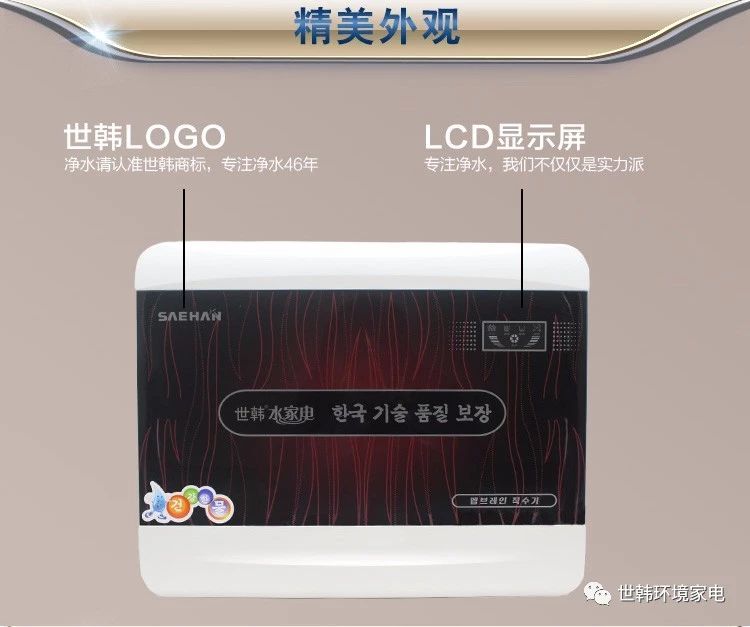 世韓凈水器有時尚簡潔的外觀,內在更加讓人考究,五層高精過濾,層層凈化,讓水中的細菌無所遁形,保證了每一滴水的純凈。