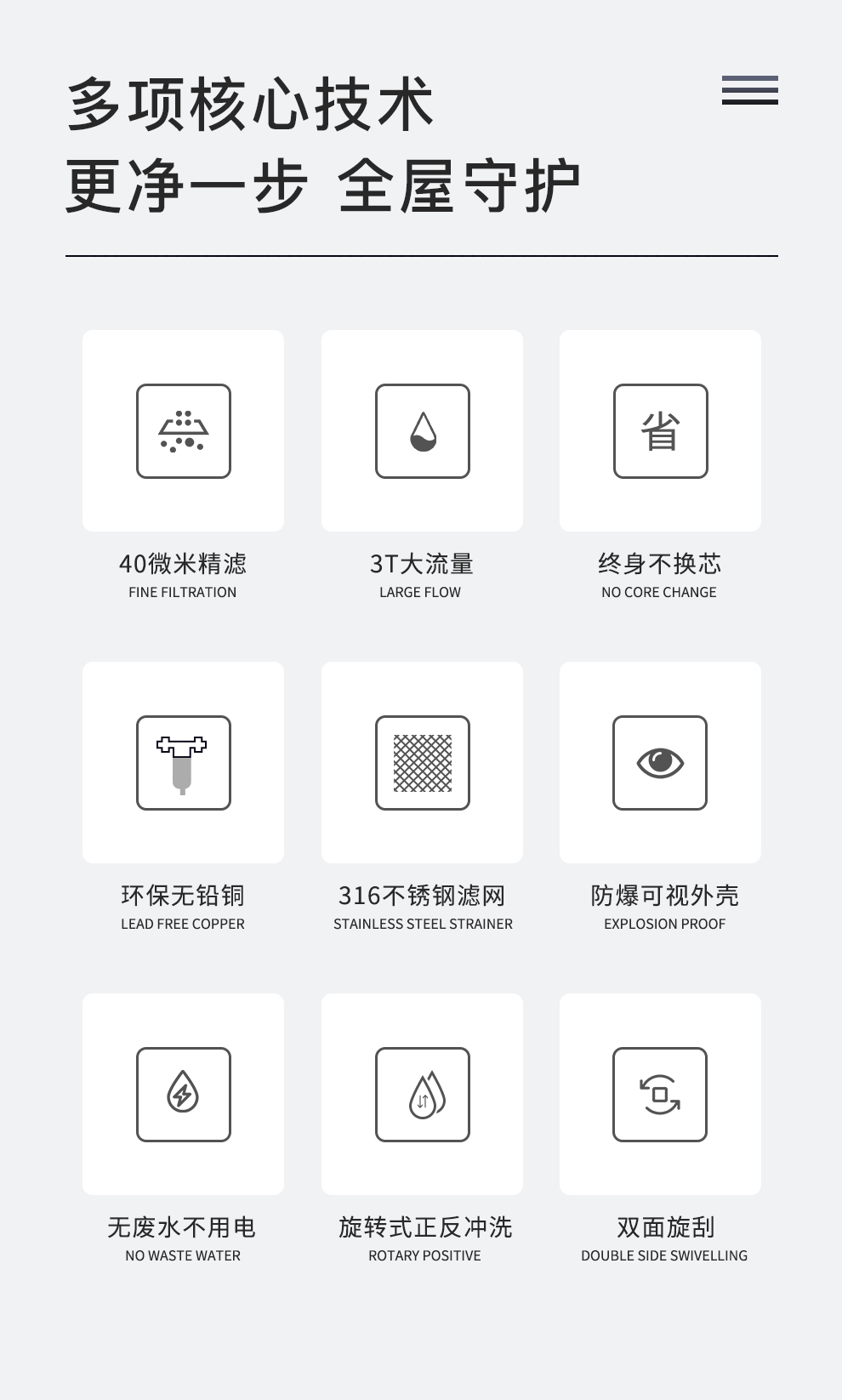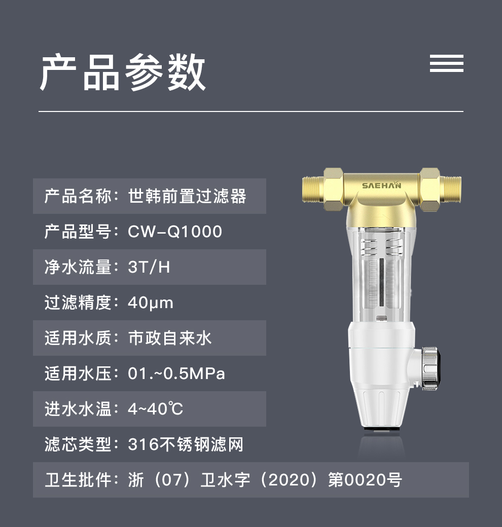 40微米過濾網,去除極細微雜質,達到PP棉過濾效果;具排污功能,隨時清除截留雜質;專利雨刮式清潔軟刮,排污更科學、徹底;防爆、防水錘較PP棉有大幅度提高,大大降低漏水風險;316L不銹鋼精密網,使用壽命更長;核心部件均采用進口材料特制,抗壓能力強.