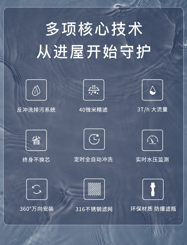 40微米過(guò)濾網(wǎng),去除極細(xì)微雜質(zhì),達(dá)到PP棉過(guò)濾效果;具排污功能,隨時(shí)清除截留雜質(zhì);專利雨刮式清潔軟刮,排污更科學(xué)、徹底;防爆、防水錘較PP棉有大幅度提高,大大降低漏水風(fēng)險(xiǎn);316L不銹鋼精密網(wǎng),使用壽命更長(zhǎng);核心部件均采用進(jìn)口材料特制,抗壓能力強(qiáng).