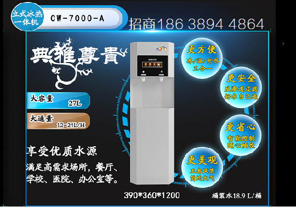 商品描述: 立式冰熱超量型,此款機型在世韓R/O直飲機家族里是最大的一款冰、熱機型,外觀上非常有特點,擺設在大的辦公空間和餐飲娛樂場所最為合適,氣勢豪華典雅,它有超大產水功能,不間斷的可滿足50人至100人的飲用優質直飲水,是一個能獨立使用,安全衛生的飲用水系統,此款機型從價格和使用功能上最為適合大中型的企業或餐飲娛樂場所使用。
