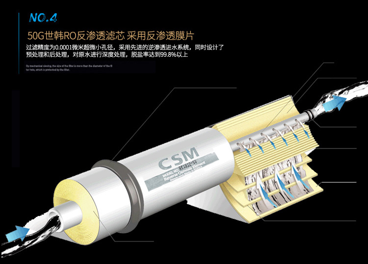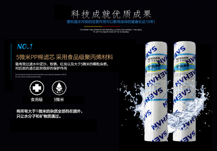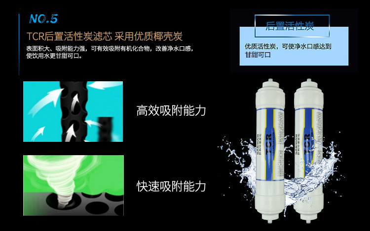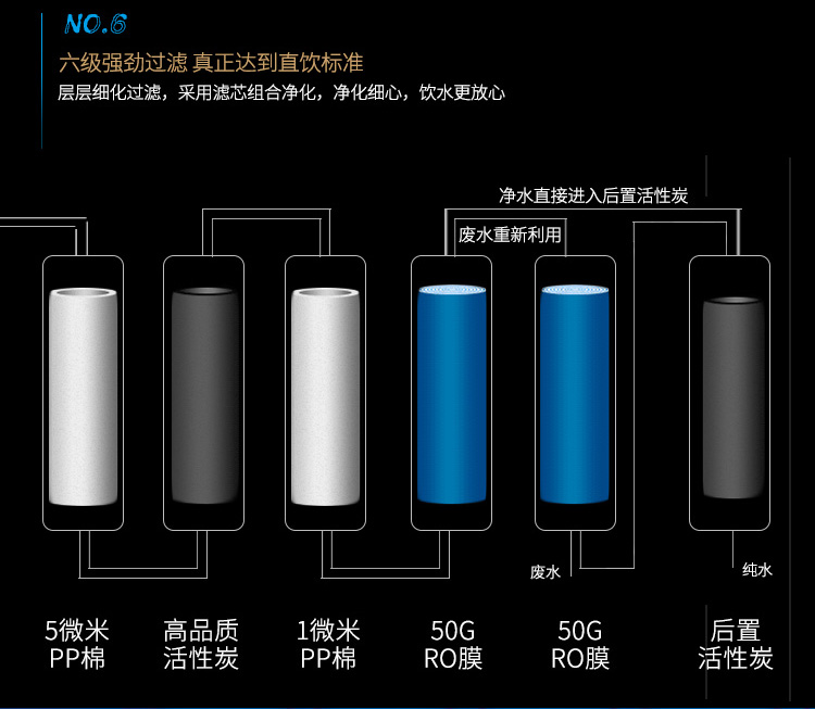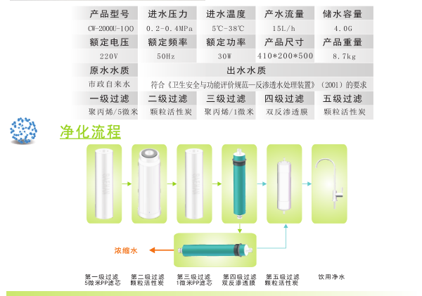 采用標準的5級凈化系統,可有效去除水中的有害物質,保證飲用水安全。